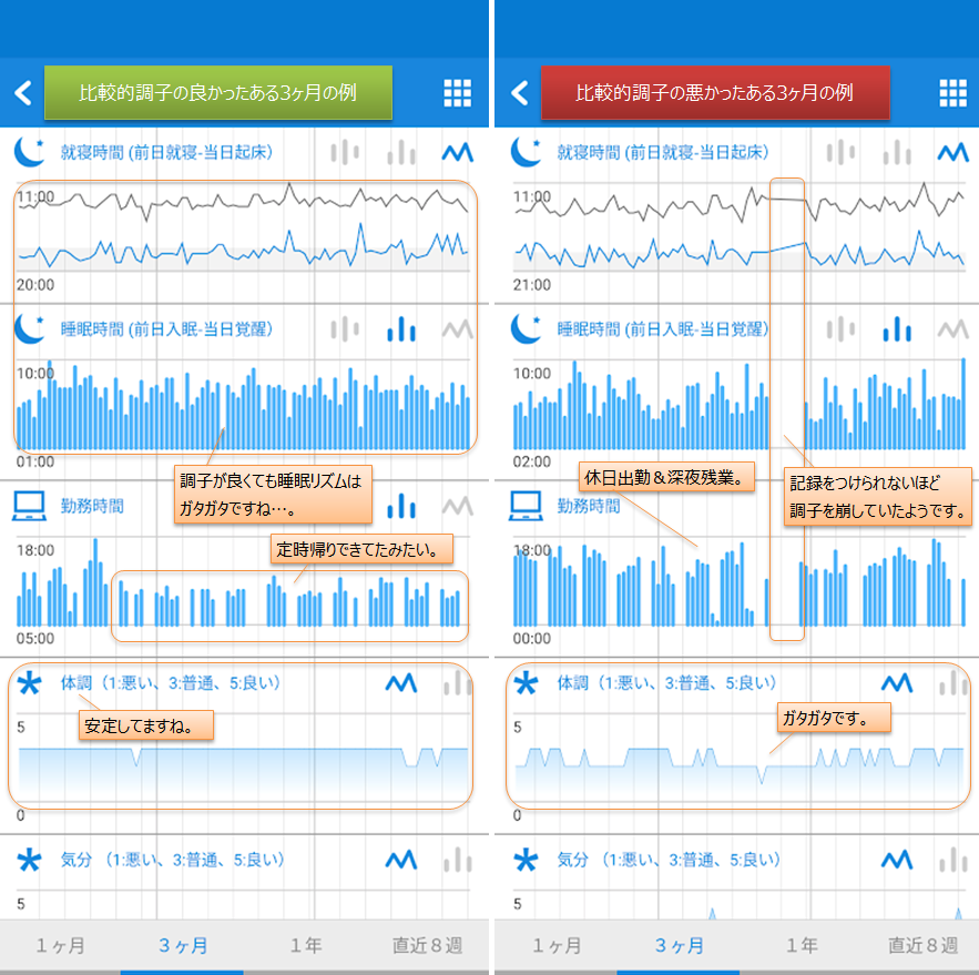 その点、記録表をつけていると(自分のパターンが分かっていると)、「睡眠時間が短いのに変に元気だな?躁状態かな?友達と会う予定を減らした方がいいかも」というように、記録表から自分の状態を客観的に判断することができます。